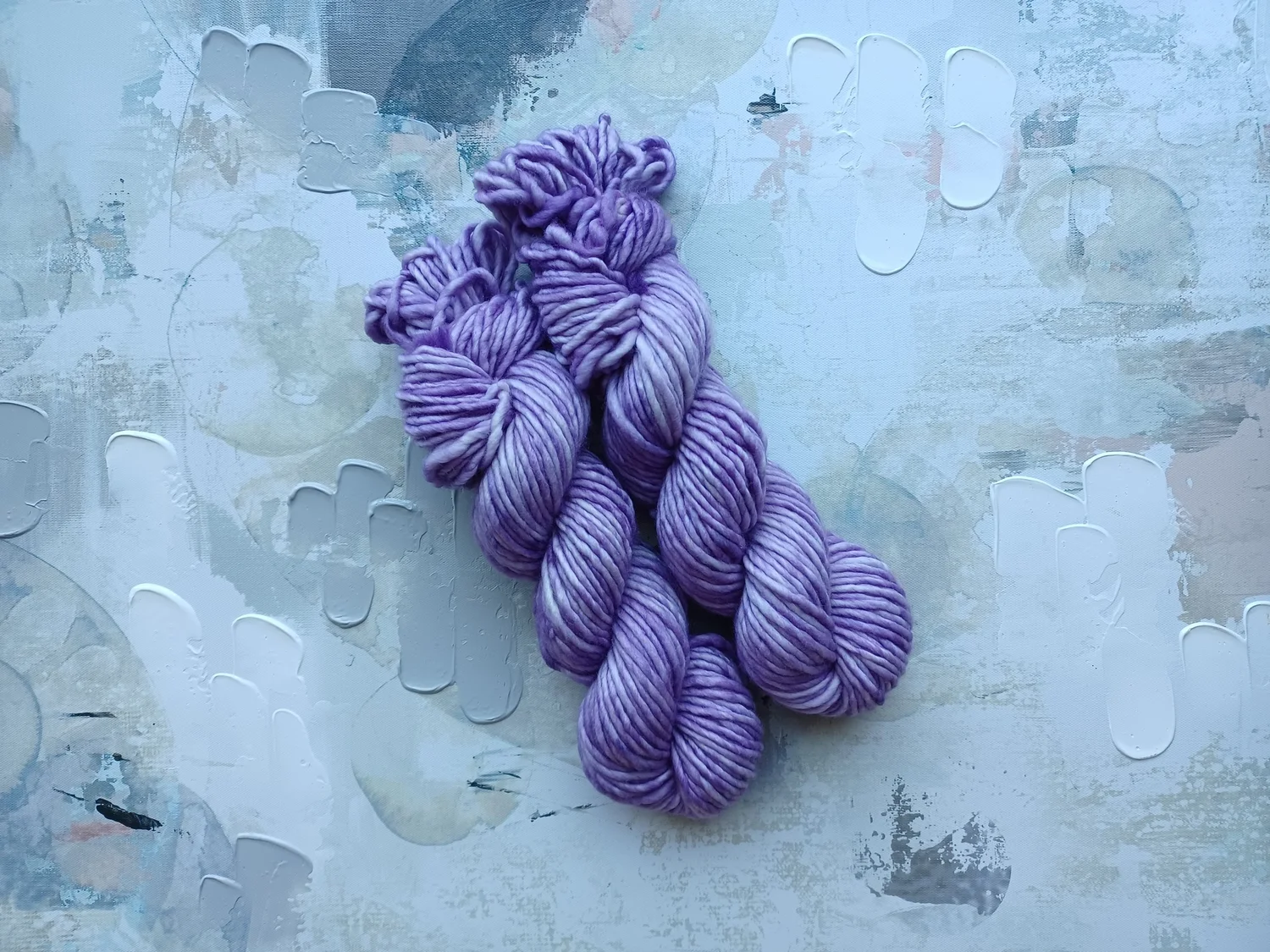 This luxurious millspun yarn has been hand dyed a tonal light purple. It coordinates very well with many colors in the shop, so take a look!