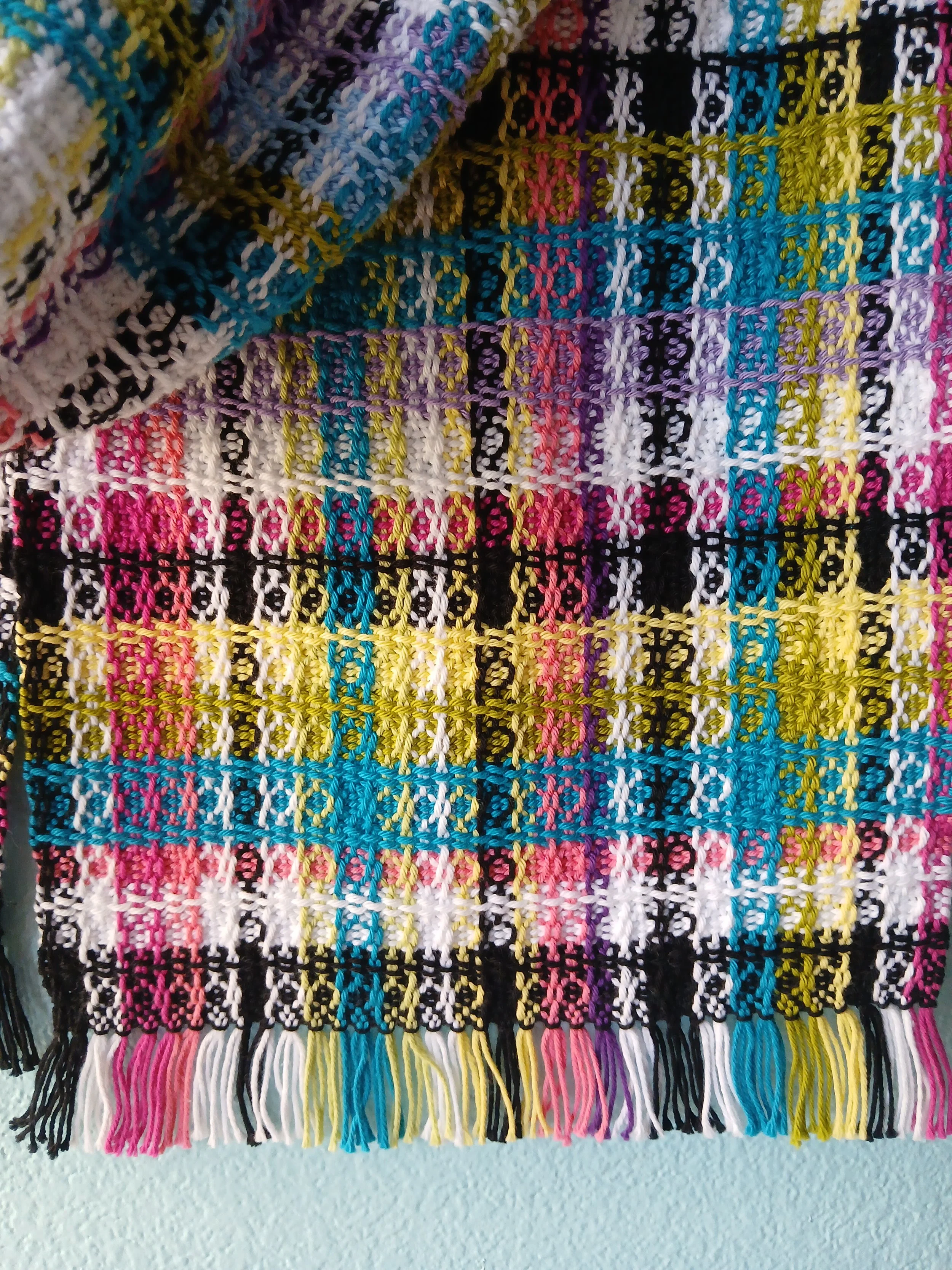 The scarf is 10.25" wide and 76.5" long, not including the 2" fringe on each end. Including the fringe, the scarf is 80.5" in total.