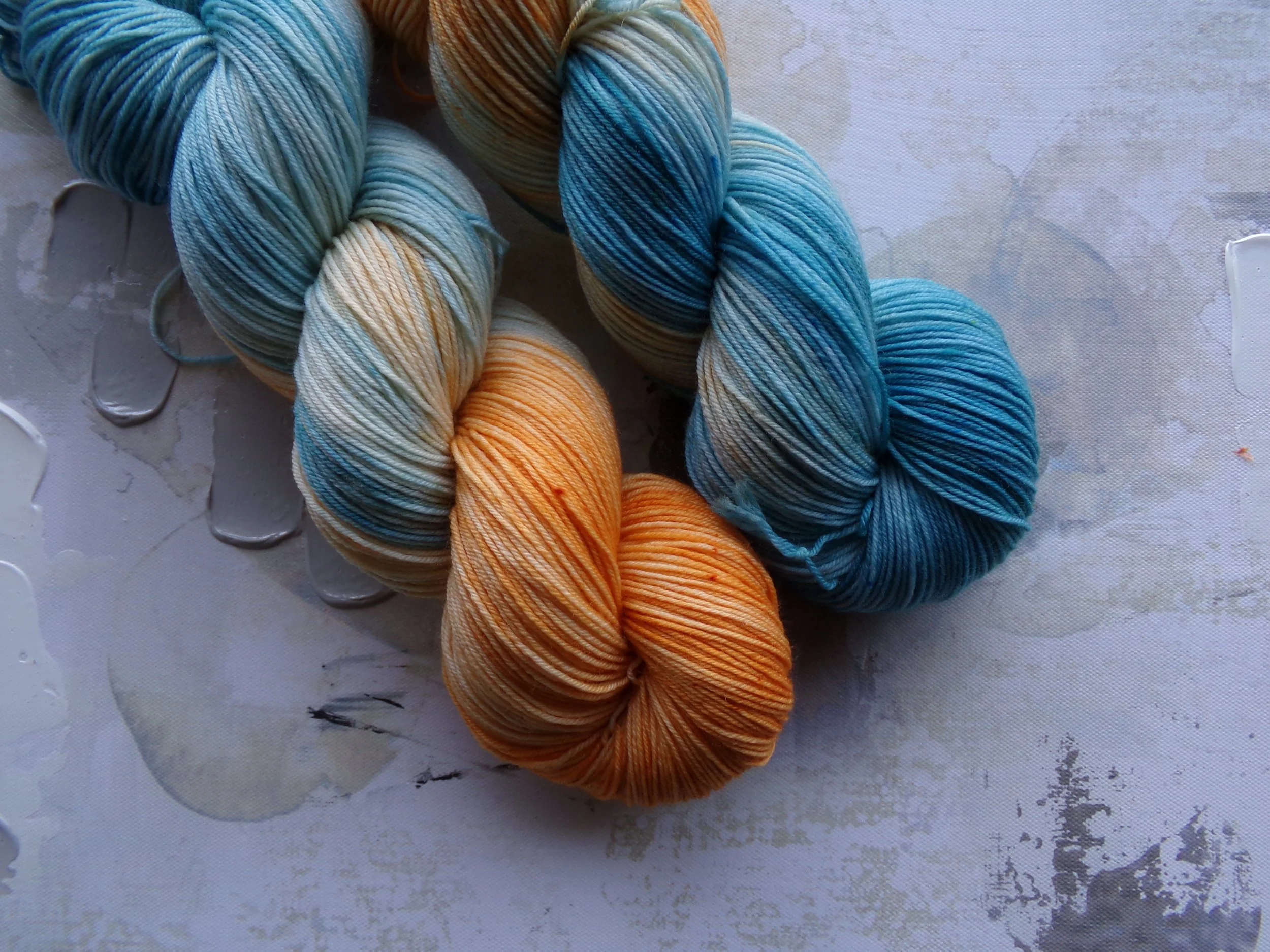 Desert Dreams - Hand-dyed Yarn, Sock Yarn, Wool Yarn - Teal Blue, Tan, and Peach - Classic Sock - Fingering Yarn- 100g, 50g